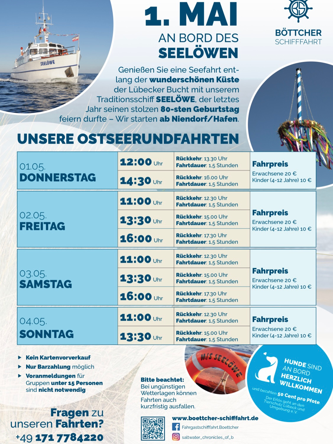 Wir machen zurzeit eine kleine Winterpause. Ab Mitte Mai 2026 starten wir wieder in die Schifffahrtssaison! Wir freuen uns auf Euren Besuch bei uns an Bord. Anfragen für Eure Charterfahrten und Veranstaltungen nehmen wir gerne jederzeit entgegen.